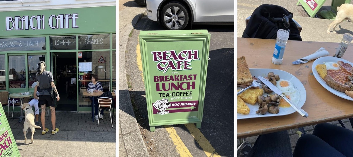 Nice cafe right by the beach. We had our breakfast here. A big and a regular English breakfast and tea.All very tasty especially the sausages.We sat outside watching the world go by. The staff even feed the dogs sausages.